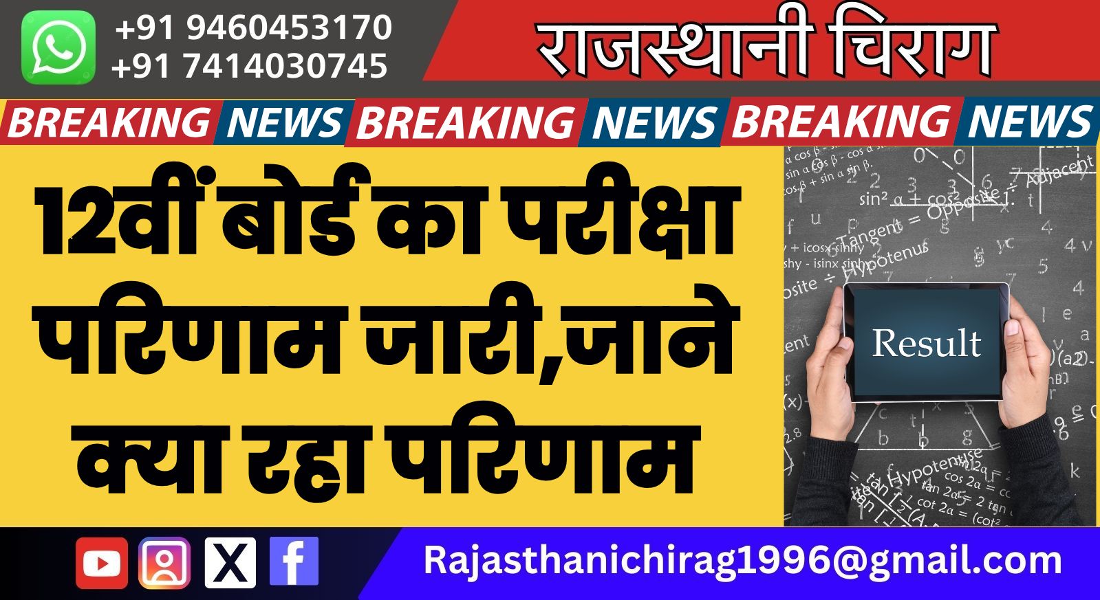 राजस्थानी चिराग। राजस्थान माध्यमिक शिक्षा बोर्ड ने 12वीं कक्षा का परिणाम जारी हो गया है। शिक्षा एवं पंचायती राज मंत्री मदन दिलावर ने अजमेर स्थित बोर्ड कार्यालय से ऑनलाइन जुड़कर परिणाम की घोषणा की। बोर्ड ने तीनों सब्जेक्ट (साइंस, कॉमर्स और आट्?र्स) का परिणाम एक साथ जारी किया। आर्ट्स का 97.70 प्रतिशत, कॉमर्स का 99.07 प्रतिशत और विज्ञान संकाय में 94.43 प्रतिशत रिजल्ट रहा है।