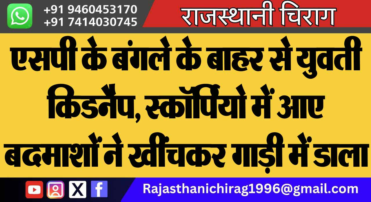 भीलवाड़ा में एसपी के बंगले के सामने से दिनदहाड़े युवती का किडनैप हो गया। ब्लैक स्कॉर्पियो में आए लोगों ने युवती को खींचकर गाड़ी में डाला और रफ्तार में गाड़ी दौड़ाते हुए भाग निकले। मौके पर मौजूद पुलिस के जवानों ने रोकने की कोशिश की तो उनको कुचलने का प्रयास किया। ससुराल पक्ष आरोप कि स्कॉर्पियो में युवती के पीहर पक्ष के लोग थे। उनका दावा है कि युवक और युवती ने कोर्ट मैरिज कर ली थी, लेकिन युवती के परिवार वाले इससे नाराज थे। घटना कलेक्ट्रेट परिसर के पास एसपी ऑफिस से महज 50 मीटर दूरी पर बुधवार शाम करीब 6 बजे हुई।