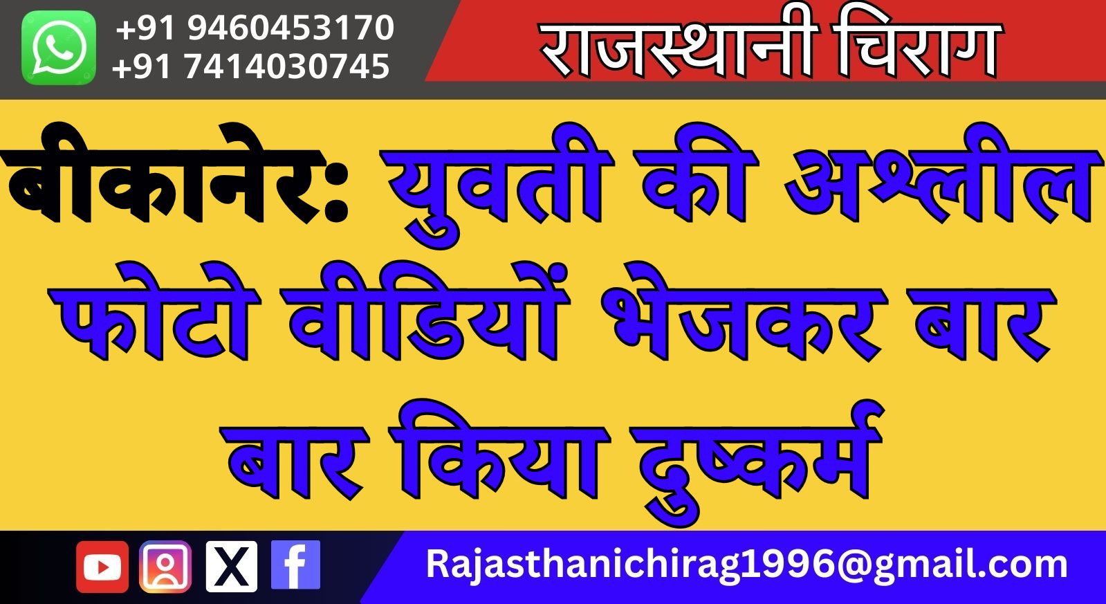 बीकानेर: युवती की अश्लील फोटो वीडियों भेजकर बार बार किया दुष्कर्म