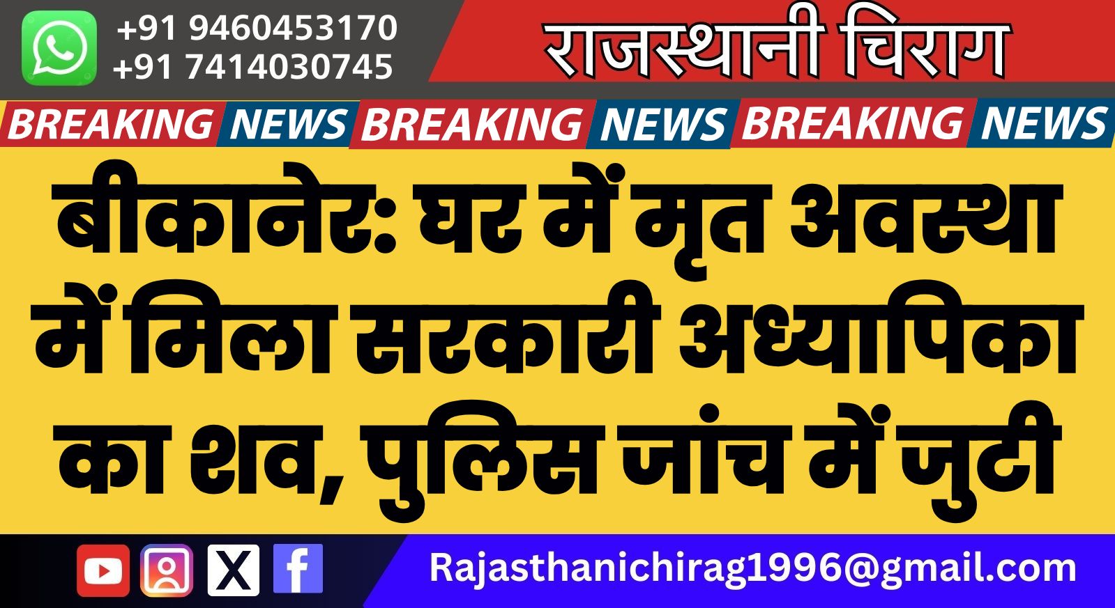 बीकानेर: घर में मृत अवस्था में मिला सरकारी अध्यापिका का शव, पुलिस जांच में जुटी