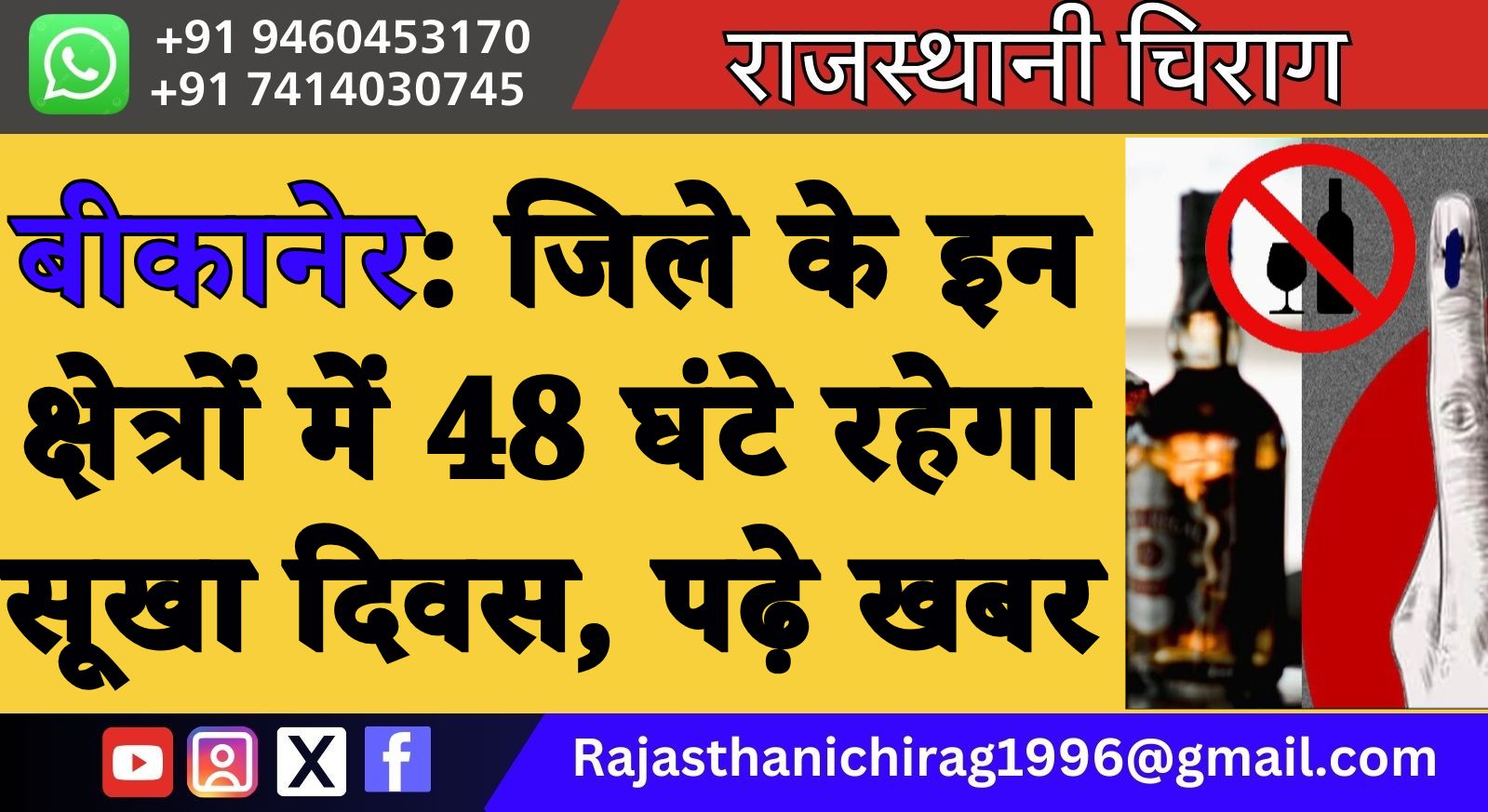 बीकानेर। राजस्थान में पंचायती राज संस्थाओं के उपचुनाव को लेकर जिला प्रशासन ने तैयारियां तेज कर दी हैं। जिला मजिस्ट्रेट कार्यालय एवं अतिरिक्त जिला मजिस्ट्रेट (नगर) रमेश देव ने आदेश जारी कर संबंधित निर्वाचन क्षेत्रों और उनके 5 किलोमीटर परिधीय क्षेत्र में 6 जून, सायं 5 बजे से 8 जून, सायं 5 बजे तक सूखा दिवस घोषित किया है। जहां पंच और सरपंच के चुनाव हो रहे हैं, वहां मतदान की तारीख 8 जून को मतगणना समाप्त होने तक सूखा दिवस लागू रहेगा। प्रशासन ने इस दौरान शराब की बिक्री और वितरण पर पूर्ण प्रतिबंध लगाने के निर्देश दिए हैं ताकि चुनाव प्रक्रिया निष्पक्ष और शांतिपूर्ण ढंग से संपन्न हो सके।