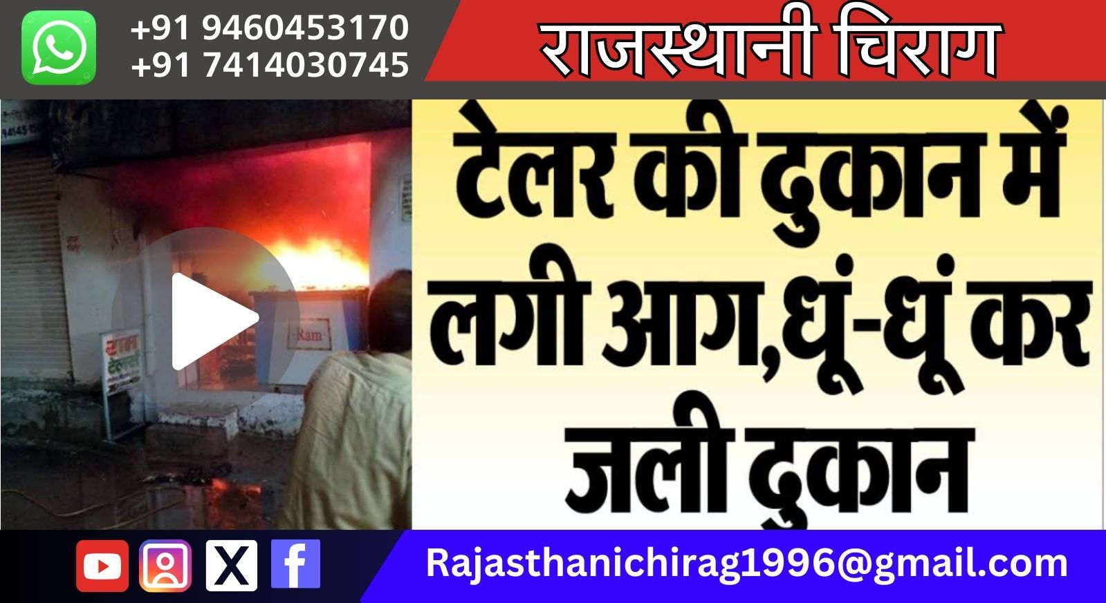 राजस्थानी चिराग,बीकानेर। टेलर की दुकान में आग लग जाने की खबर सामने आयी है। घटना खाजूवाला पुलिस थाना क्षेत्र के सोसायटी रोड़ की है। जहां पर टेलर की दुकान में अचानक आग लग गयी। आग लगने के कारण कुछ ही मिनटों में दुकान धूं-धूं कर जल गयी। दुकान में रखे कपड़े और अन्य सामान जलकर राख हो गया। जानकारी के अनुसार यह आग शार्ट सर्किट के कारण लगी है। घटना की सूचना मिलते ही नगर पालिका टीम व आसपास के लोग मौके पर पहुंचे और आग बुझाने का प्रयास किया।
