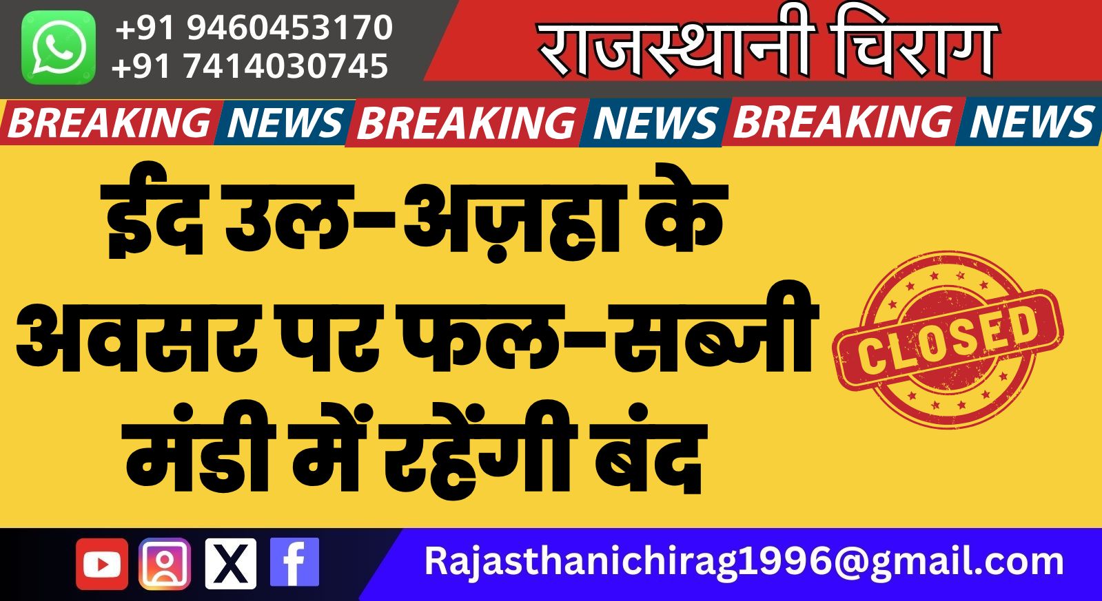 बीकानेर। बीकानेर फ्रूट वेजिटेबल मर्चेंट एण्ड कमीशन एजेंट्स सोसाइटी( रजि. ) के अध्यक्ष शांतिलाल साध ने बताया कि ईद उल-अज़हा को मध्य नजर रखते हुए 07 जून , शनिवार को फल-सब्जी मंडी में पूर्णता अवकाश रहेगा और रविवार को हमेशा की तरह फल सब्जी मंडी खुली रहेंगी।
