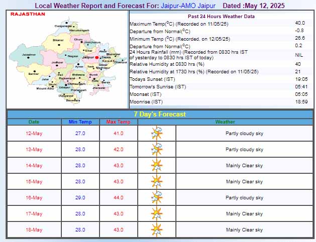 सोमवार को बीकानेर, जयपुर, भरतपुर, उदयपुर, कोटा संभाग के कुछ भागों मेघगर्जन के साथ आंधी व हल्की-मध्यम बारिश होने की संभावना है। वहीं मंगलवार से पश्चिमी राजस्थान के कुछ भागों से आंधी-बारिश की गतिविधियों में कमी होने तथा तापमान में 2-3 डिग्री बढ़ोतरी होने की संभावना है। पूर्वी राजस्थान के कोटा, उदयपुर, जयपुर, भरतपुर संभाग के कुछ भागों में 13 मई को भी कहीं-कहीं मेघगर्जन के साथ हल्की मध्यम बारिश होने की संभावना है।