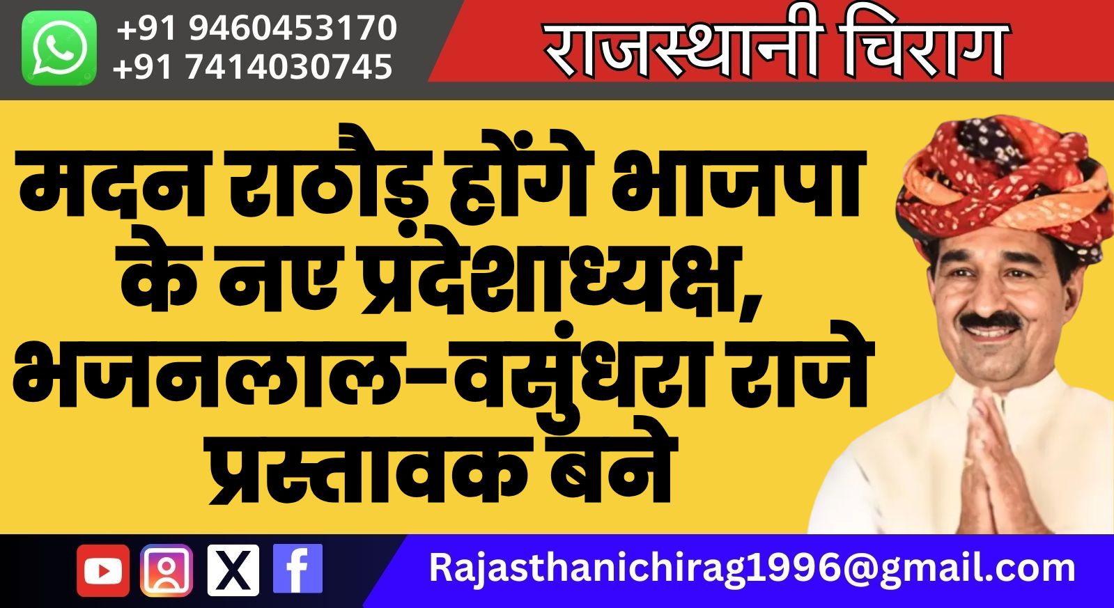 मदन राठौड़ होंगे भाजपा के नए प्रदेशाध्यक्ष, भजनलाल-वसुंधरा राजे प्रस्तावक बने