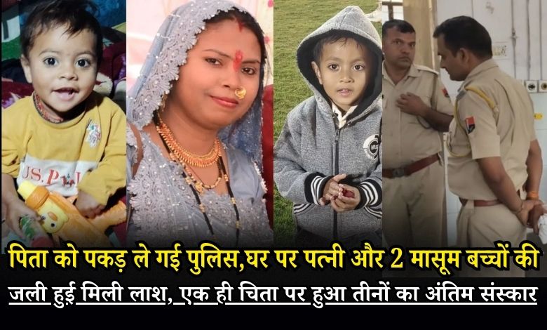 पिता को पकड़ ले गई पुलिस,घर पर पत्नी और 2 मासूम बच्चों की जली हुई मिली लाश, एक ही चिता पर हुआ तीनों का अंतिम संस्कार