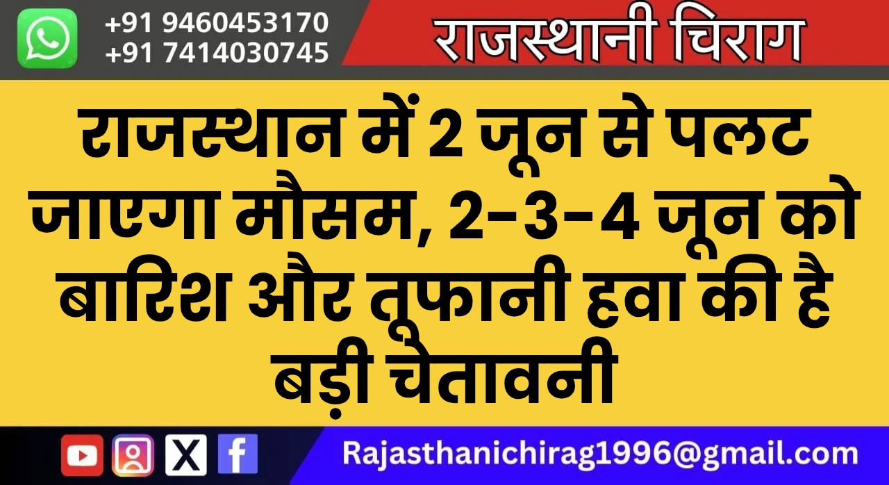 राजस्थान में 2 जून से पलट जाएगा मौसम, 2-3-4 जून को बारिश और तूफानी हवा की है बड़ी चेतावनी